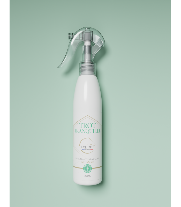 Trot Tranquille is a powerful external repellent lotion, without synthetic insecticide, with natural Margosa. Natural Margosa has antibacterial, antifungal, antiseptic but also moisturizing and softening actions. It effectively protects 2 to 3 days against ticks, fleas, mosquitoes, horse flies, gadflies.