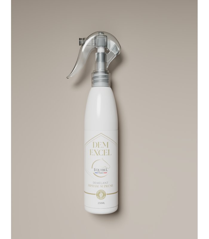 Dem'excel is a top-of-the-range two-phase, super-powerful detangler for manes, tails and baleen. Composed of a combination of cosmetic silicones and organic rice proteins, it instantly helps to overcome the most resistant knots. Rice proteins retain water, replenish horsehair and thus facilitate brushing while shining the horsehair and leaving a pleasant smell.